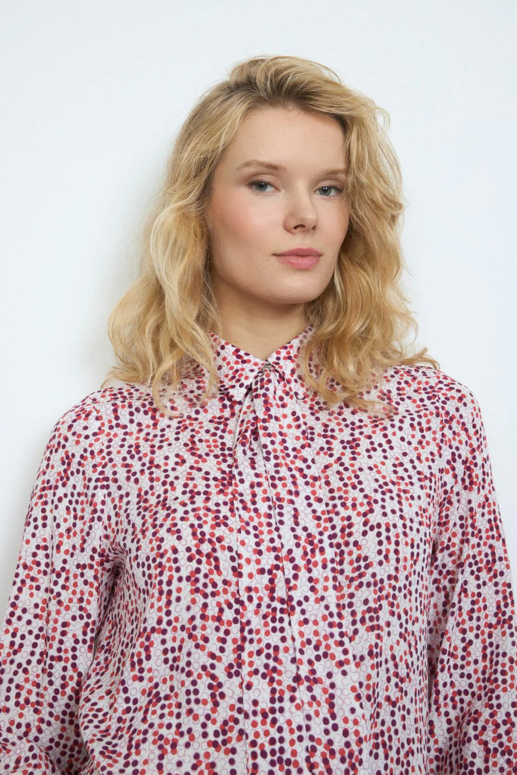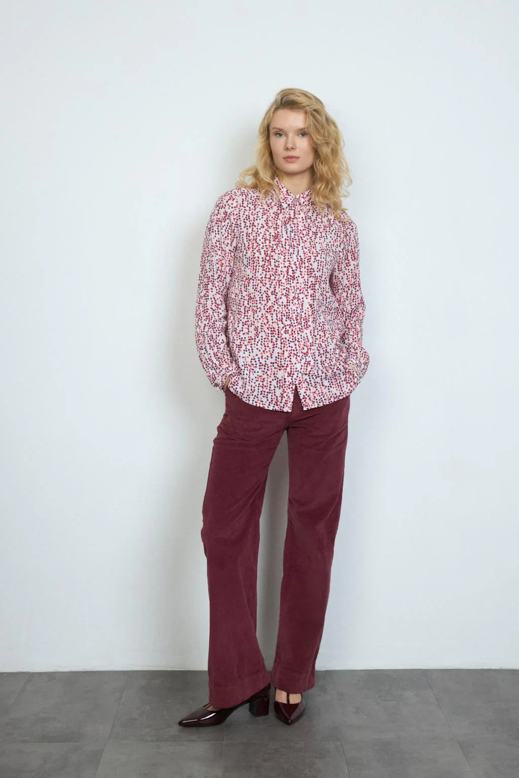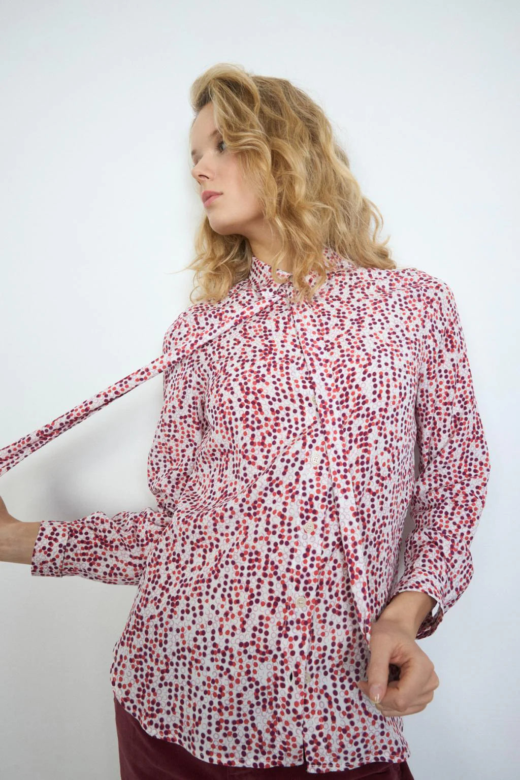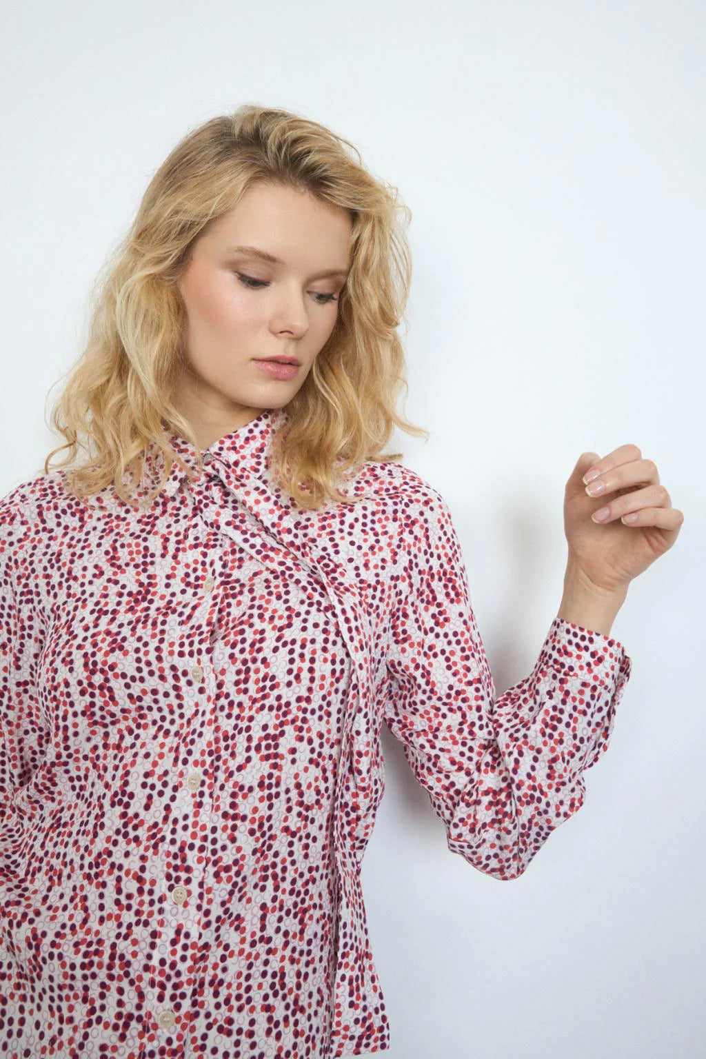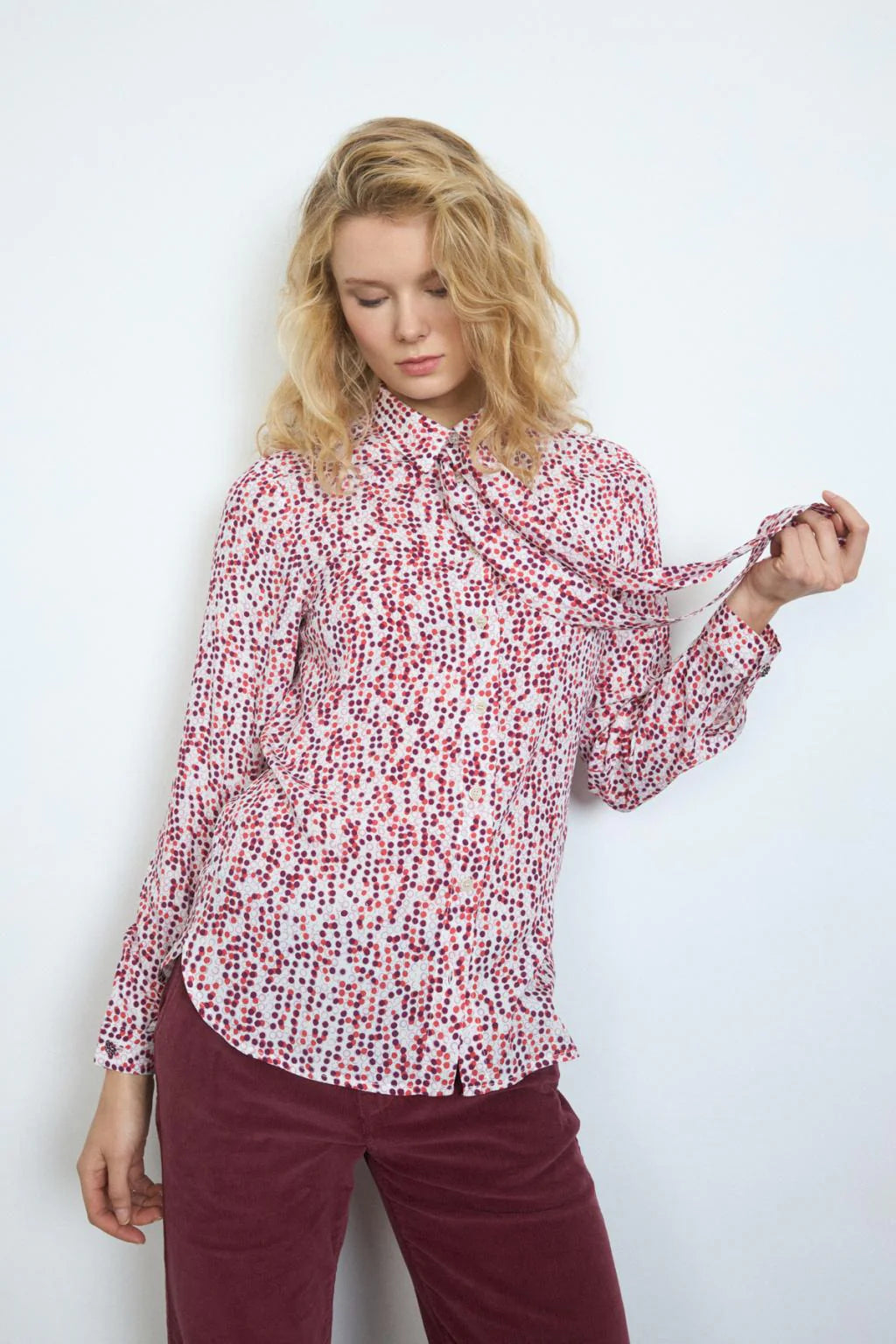 Printed shirt. Shirt collar with lacing detail. Front button closure. Straight design. Long sleeves finished in cuff with button closure. Slightly rounded bass.