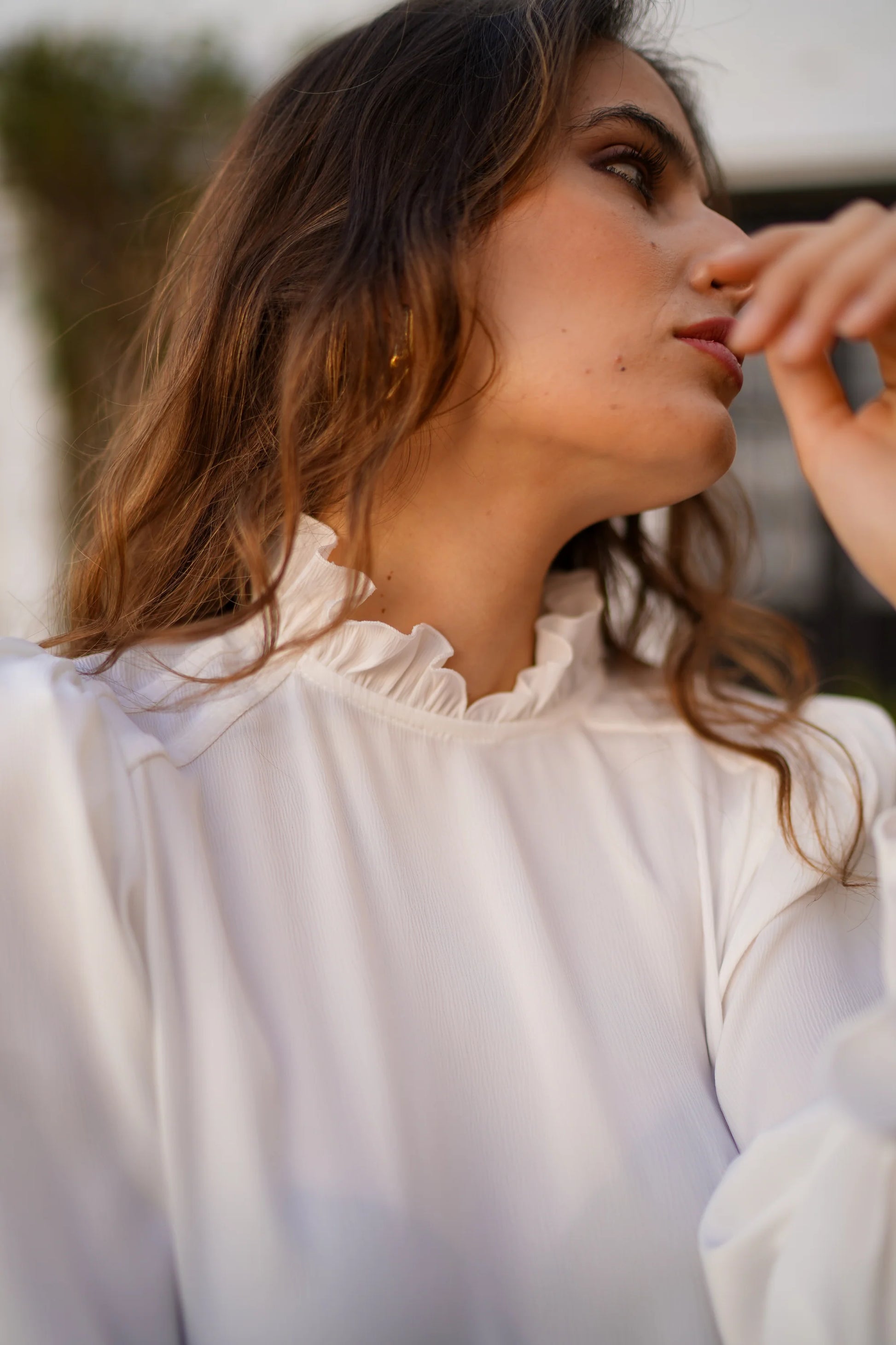 A delicate and feminine blouse crafted from lightweight fabric, featuring a ruffled neckline , adding a romantic and elegant touch. Velvet ribbons add sophistication and a distinctive detail, allowing you to adjust the knot to your liking and personalize the style to suit the occasion.