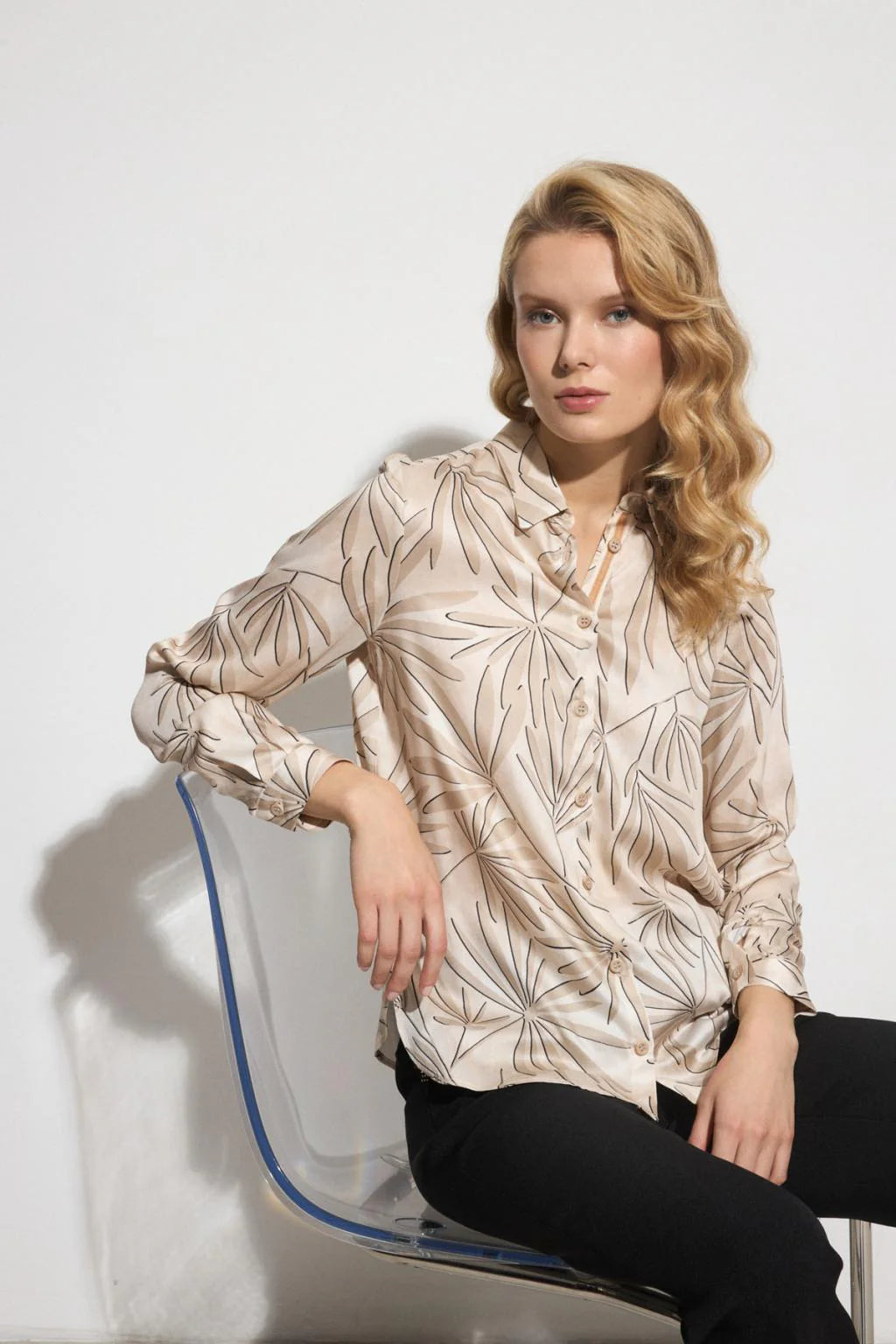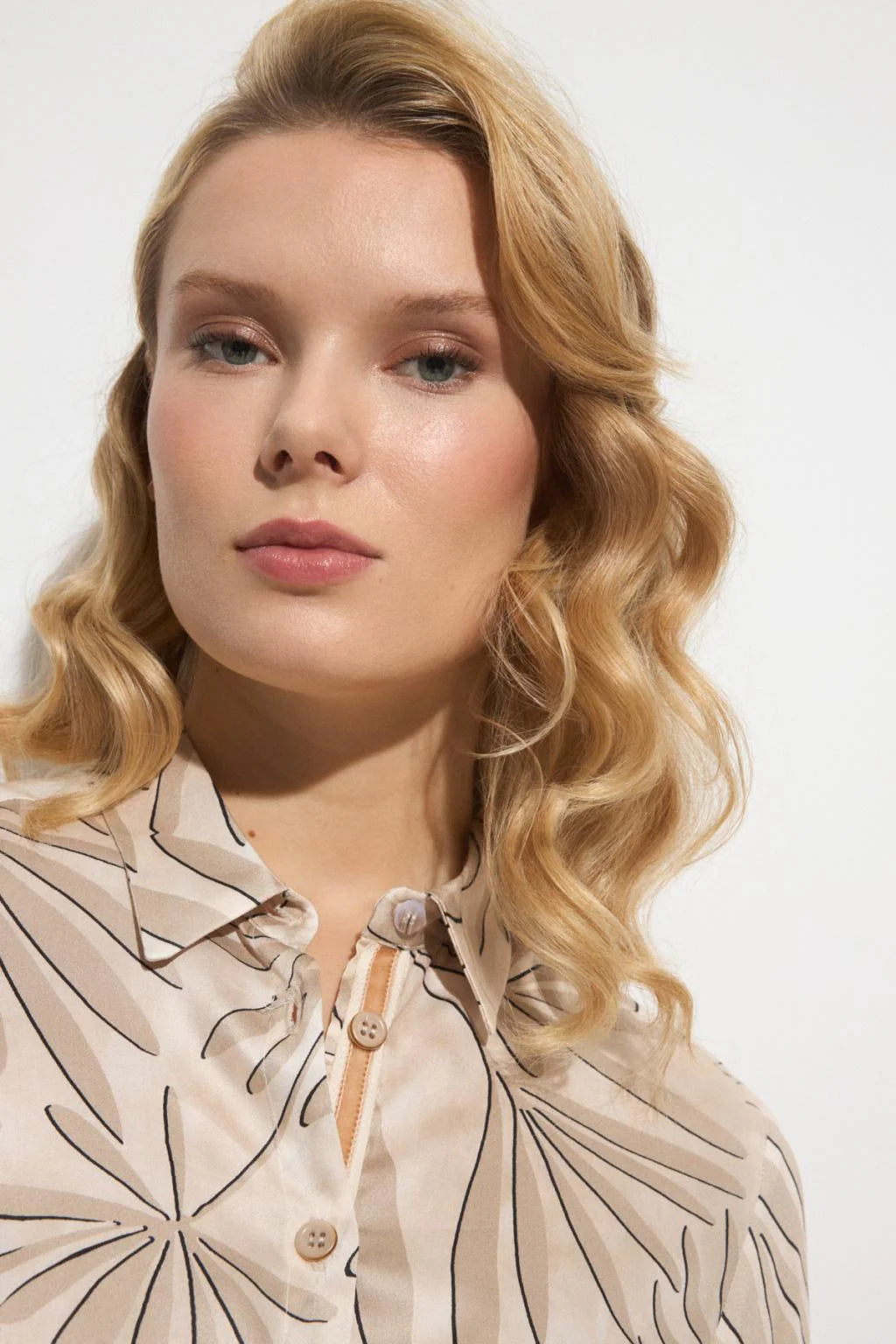 Fluid shirt with plant motif print. Shirt collar. Front button closure. Straight design. Long sleeves finished in cuff with button closure. Slightly rounded tops with small side openings.