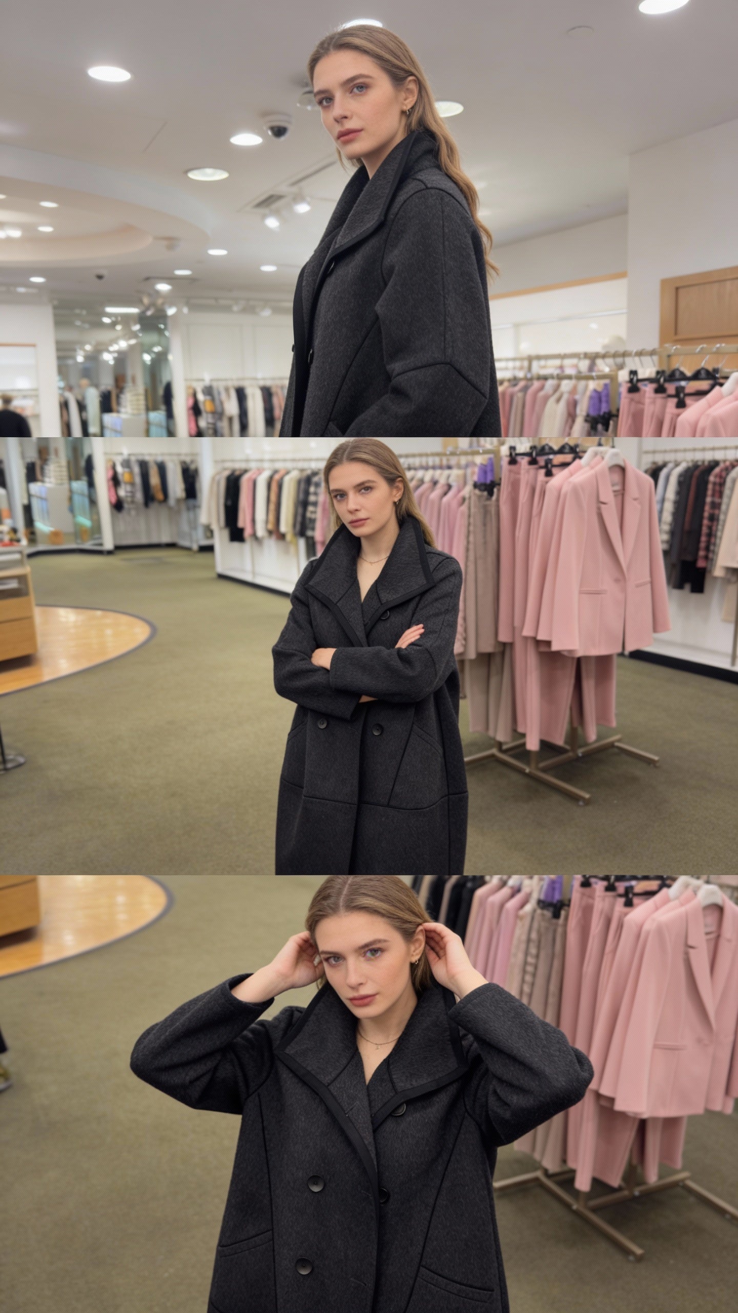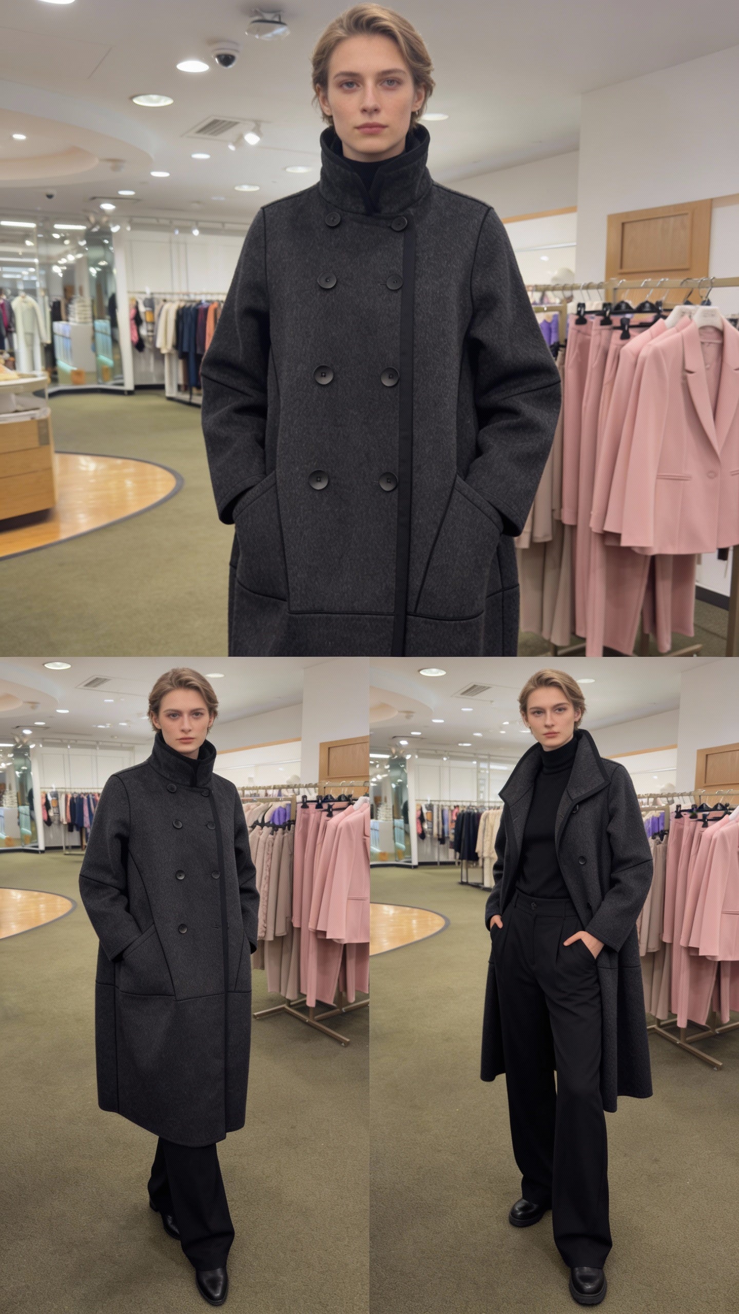 Is a modern, elegant outerwear oversized piece designed for understated sophistication. Crafted from a premium blend of 80% Australian wool, 10% cashmere, and 10% TENCEL™, it offers exceptional warmth, softness, and breathability with a smooth, structured drape. The minimalist silhouette, refined button detailing, and sculpted high collar create a sleek, contemporary look—perfect for polished everyday wear and elevated winter styling.