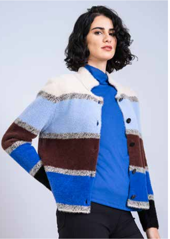 cozy knit cardigan with bold color-block stripes in blue, brown, beige, and cream, finished with front button closure and a soft textured feel.