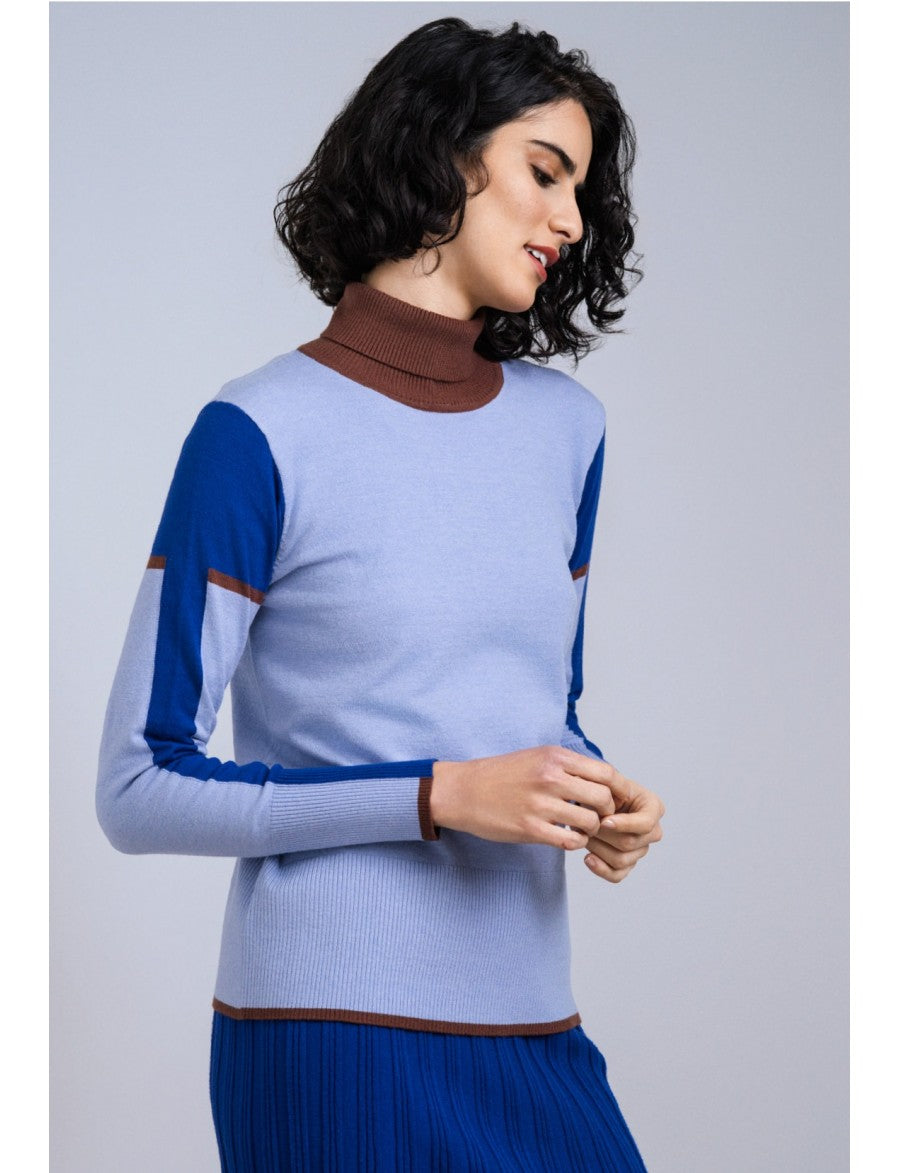 slim fit knit blouse in light blue with contrast royal blue sleeves and brown trim details, finished with a ribbed hem and cuffs.