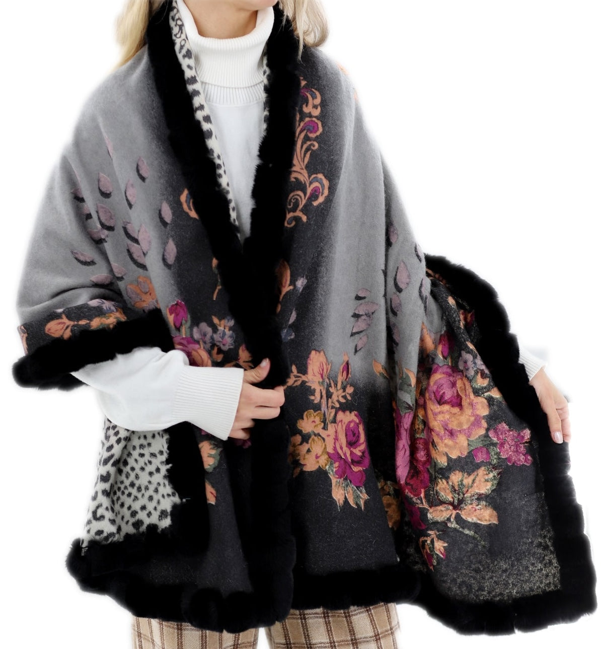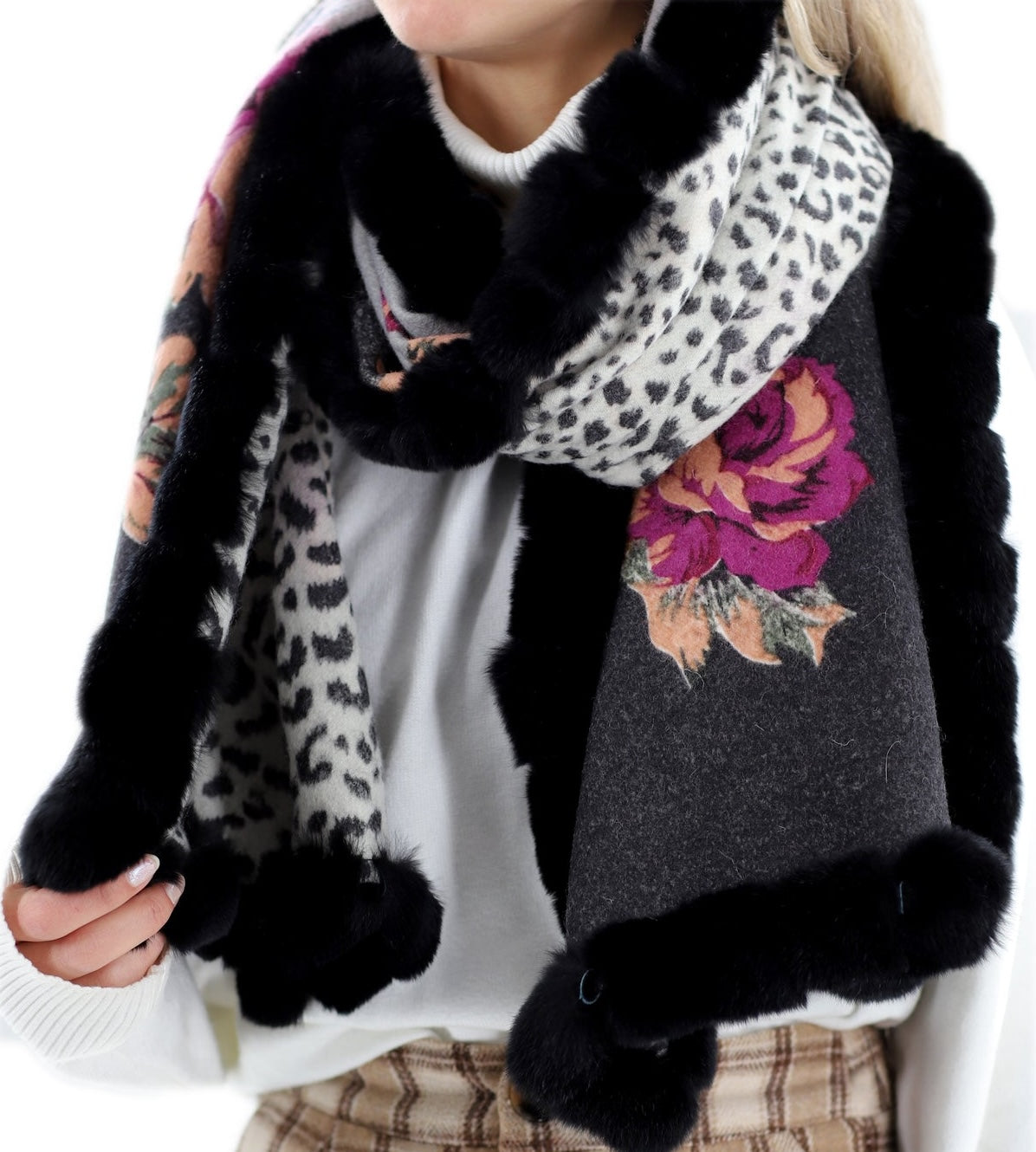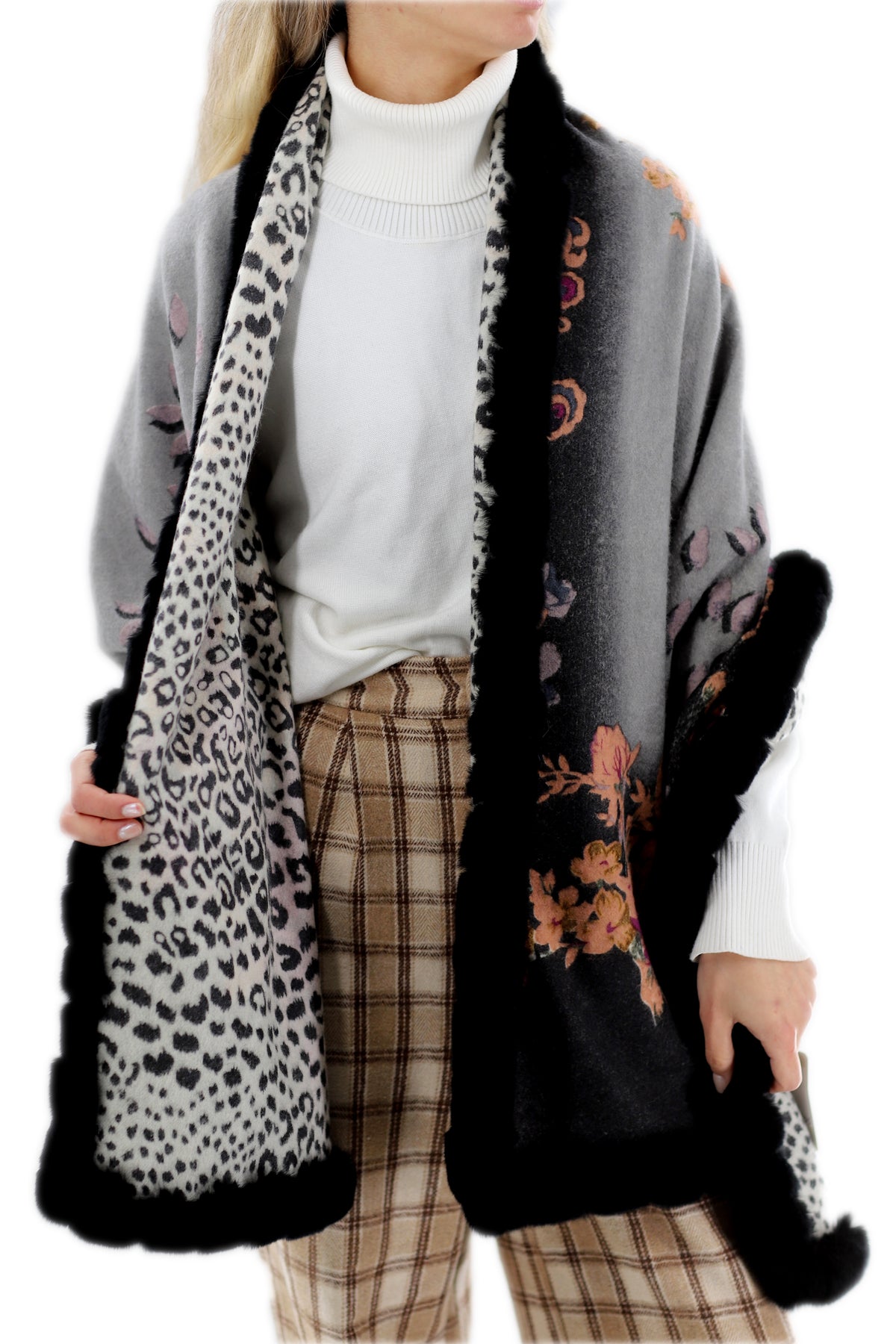 - Floral Reversible Animal Print Wrap with Genuine Real Rex Rabbit Fur Trim