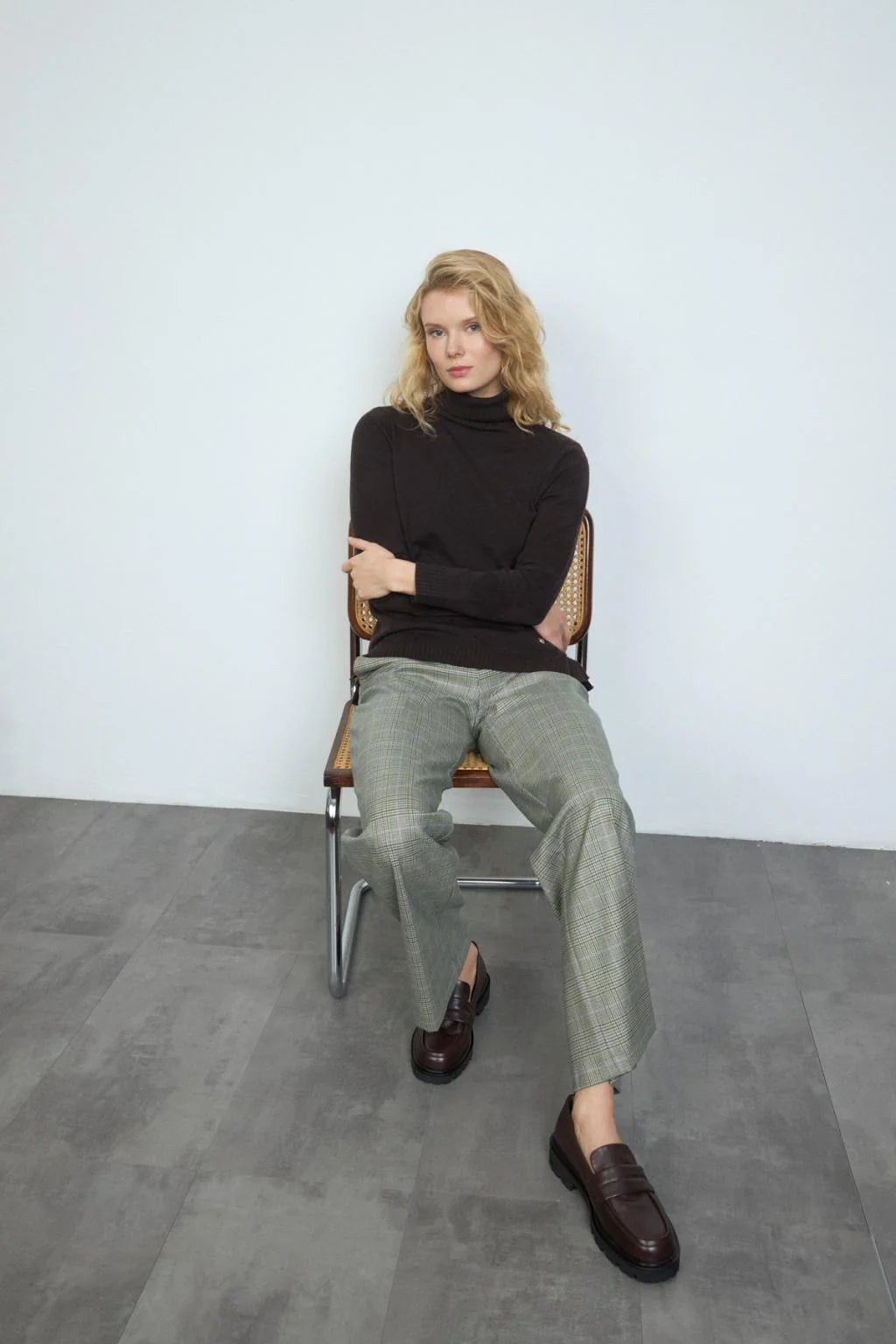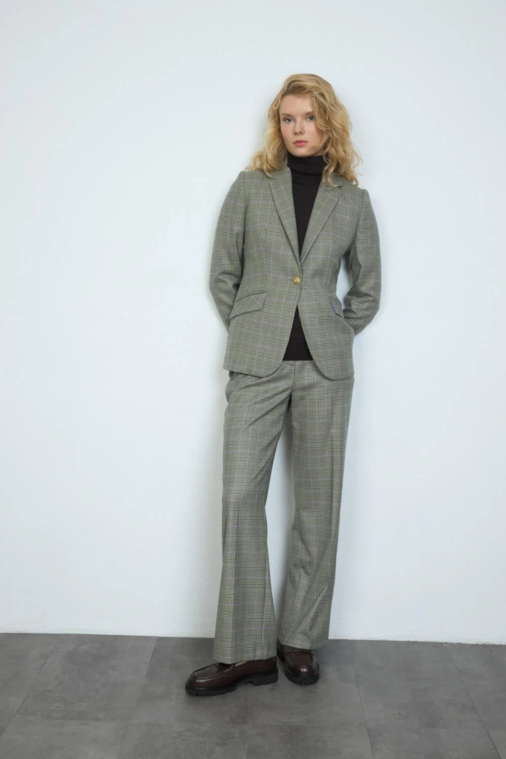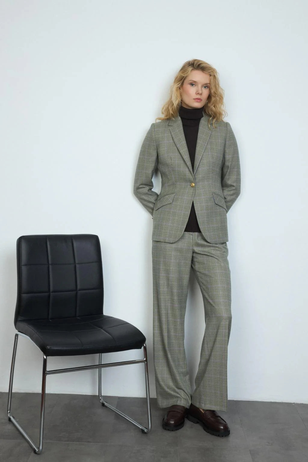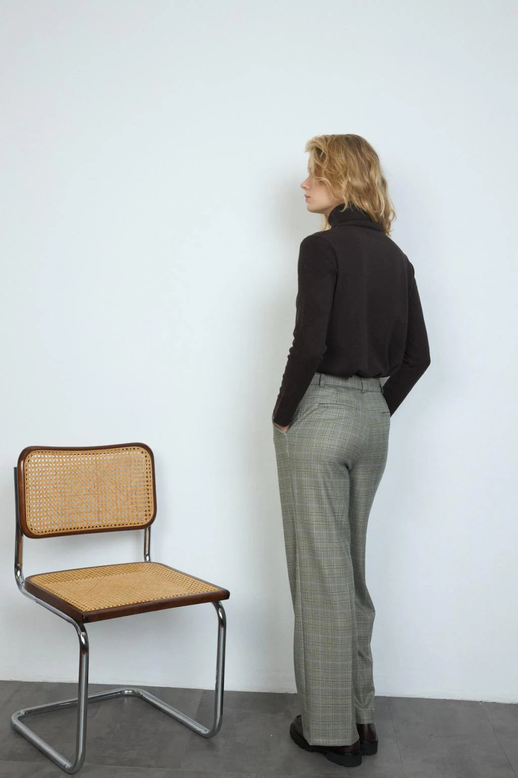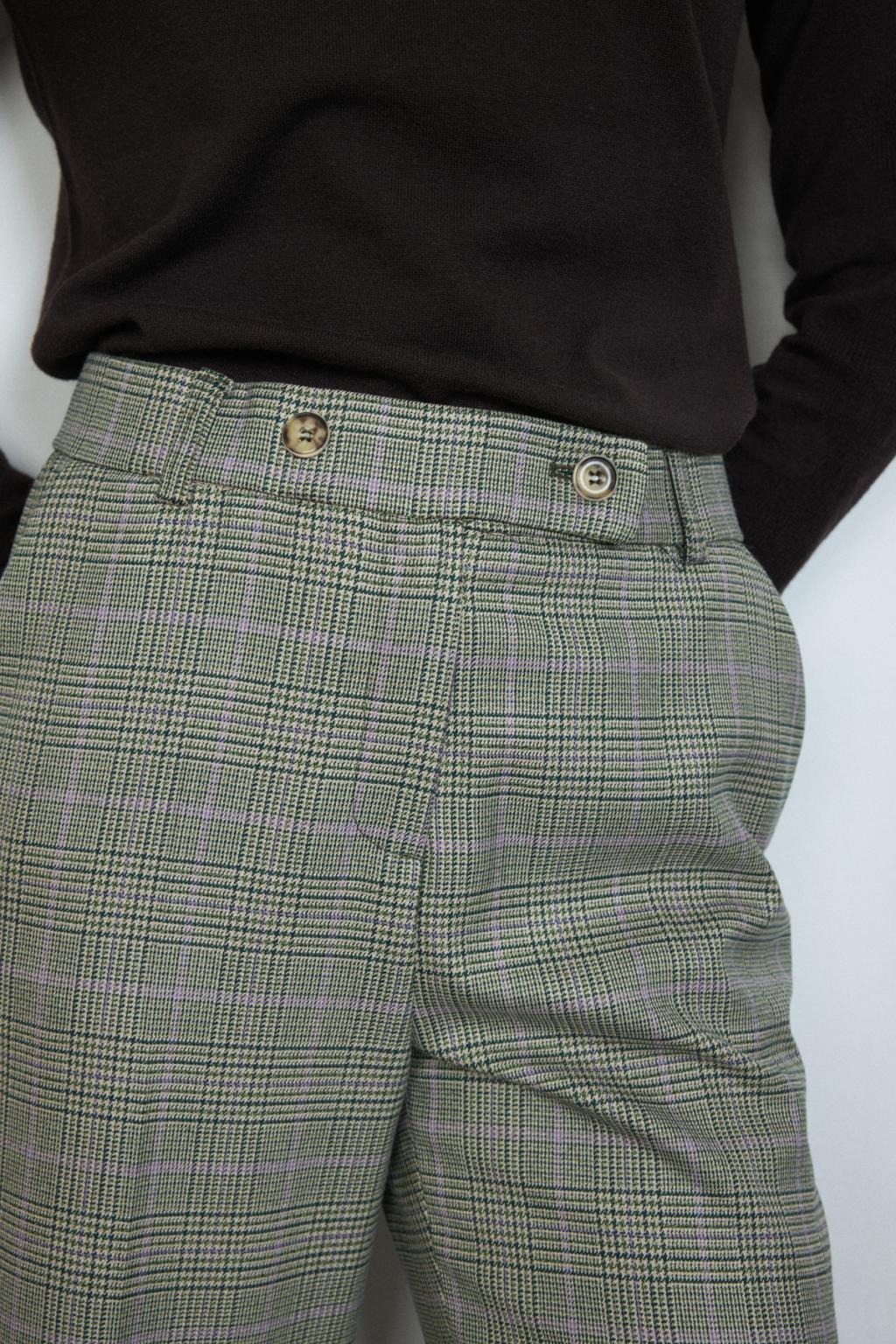 Wide pants. Checkered print. High shot. Waist with loops and detail of front buttons to the tone. Button closure and hidden zipper. Pockets on the edge on the sides.