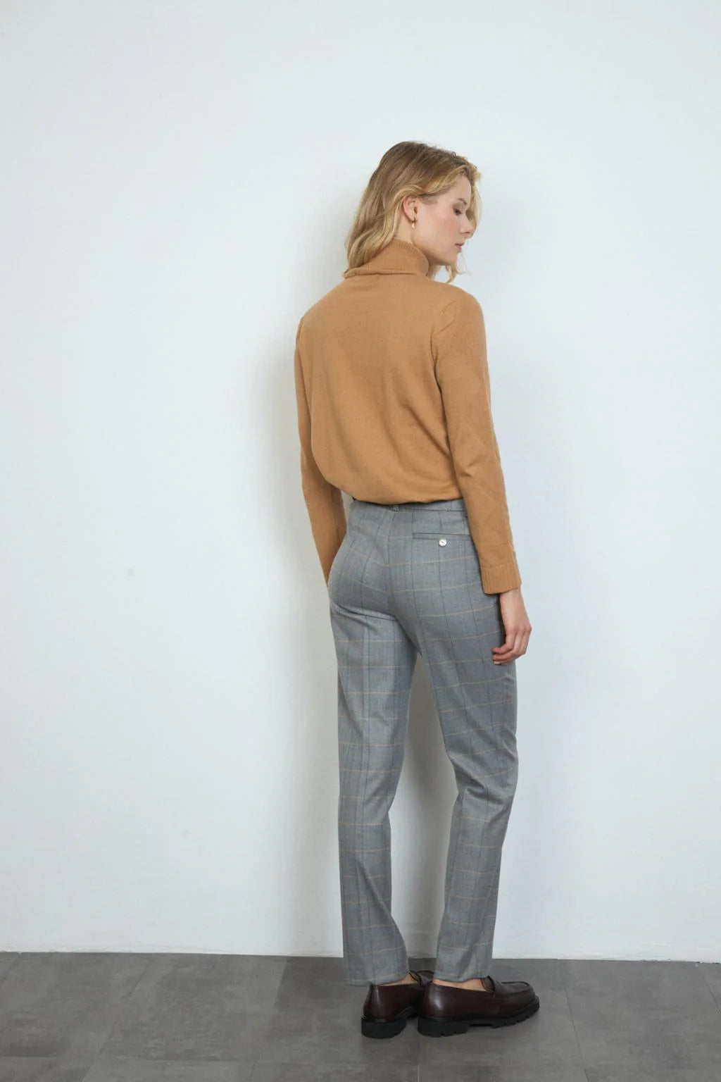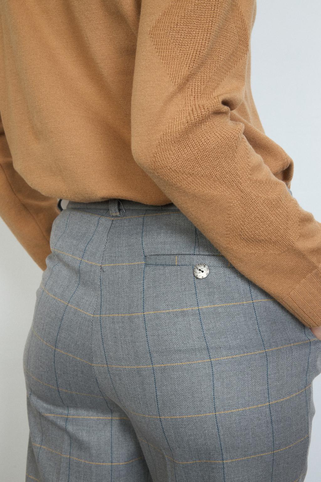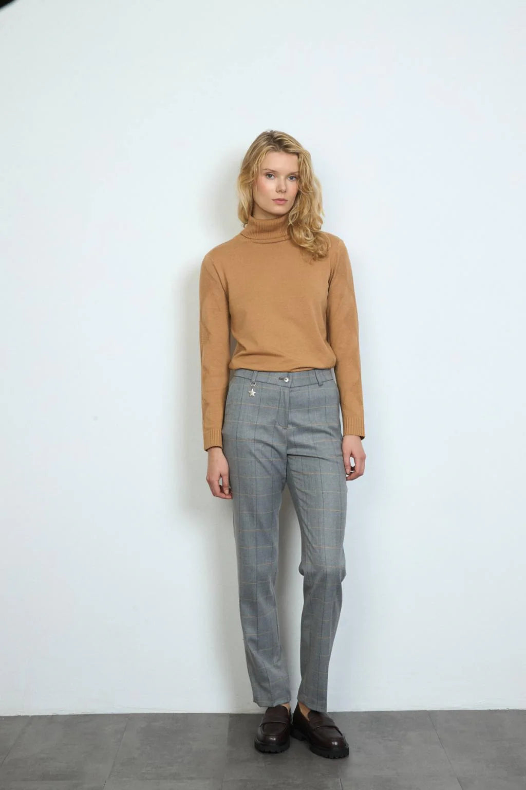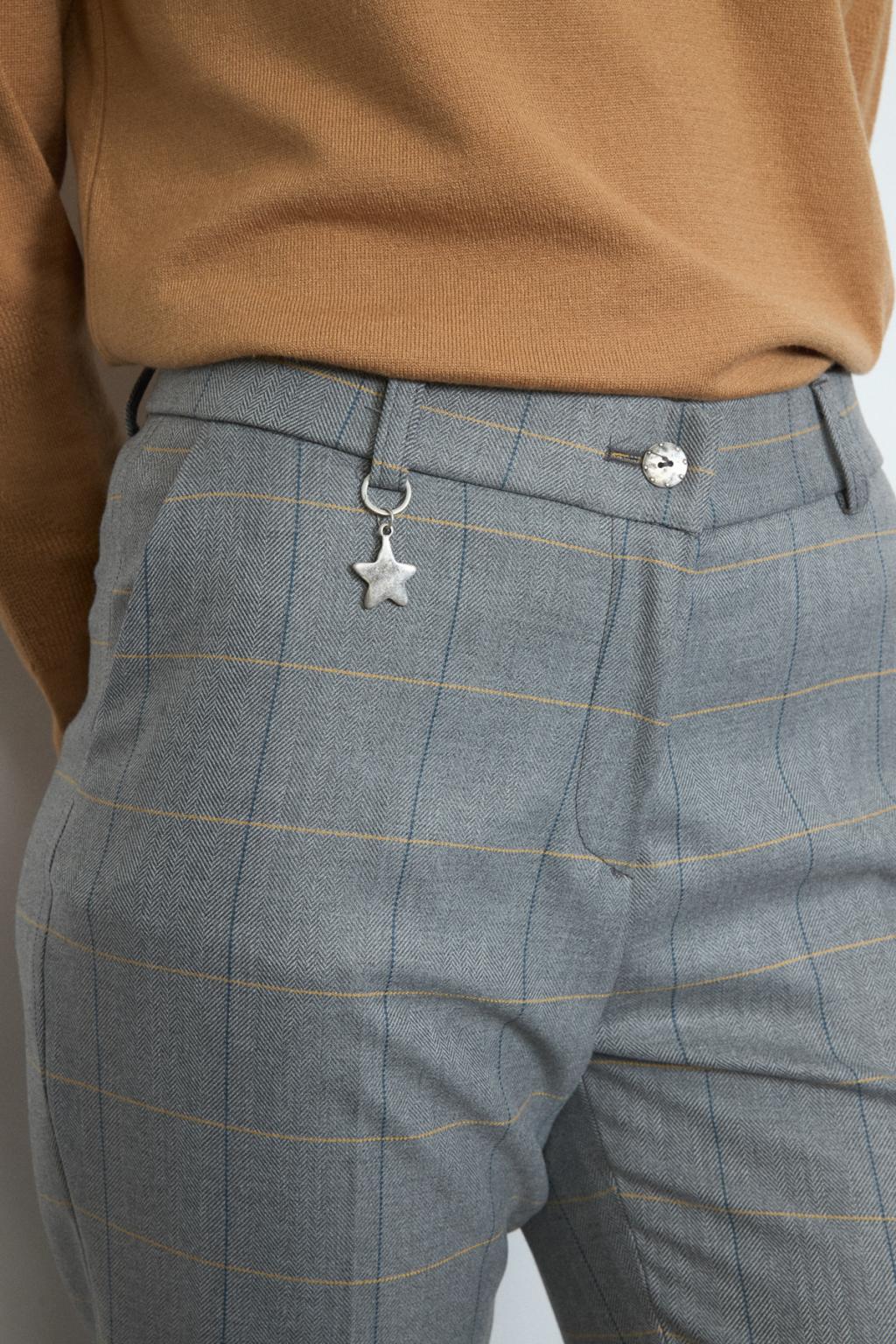 Straight suit pants. Checkered print. Medium shot. Waist with loops and button and zipper closure. Detail of metallic star pendant on loop. Pockets on the edge on the sides.