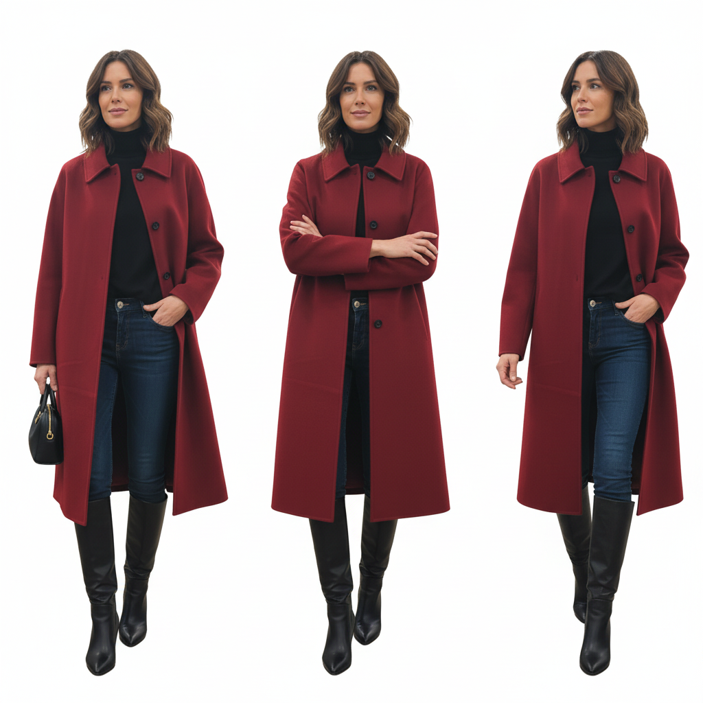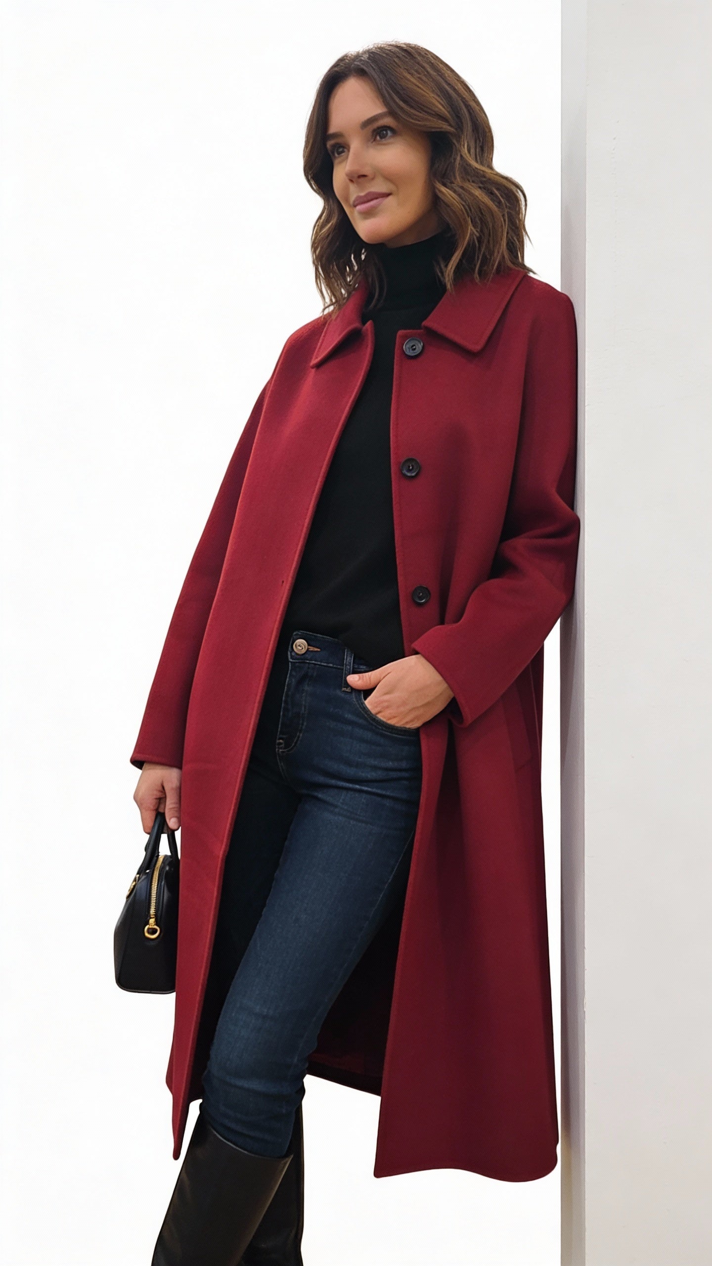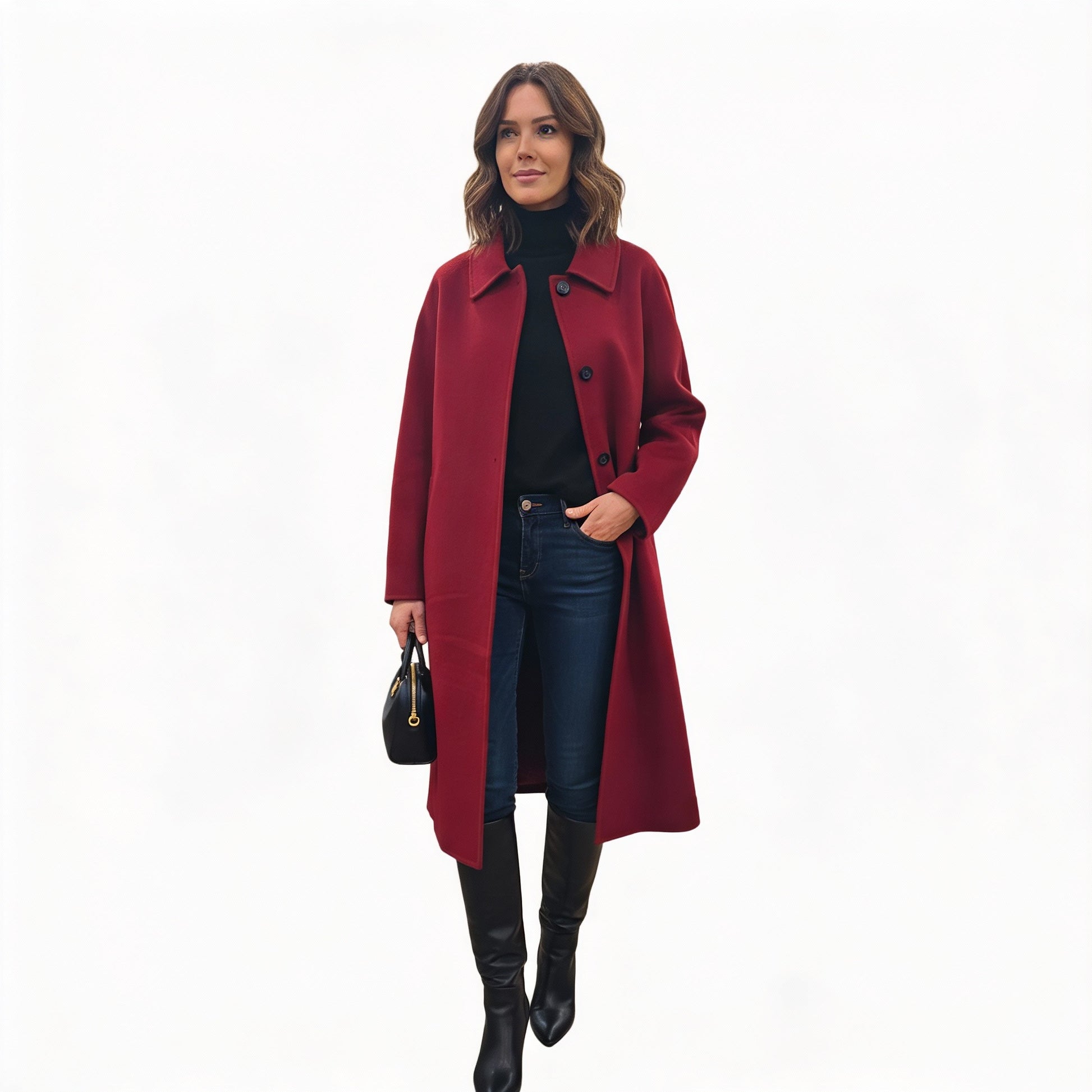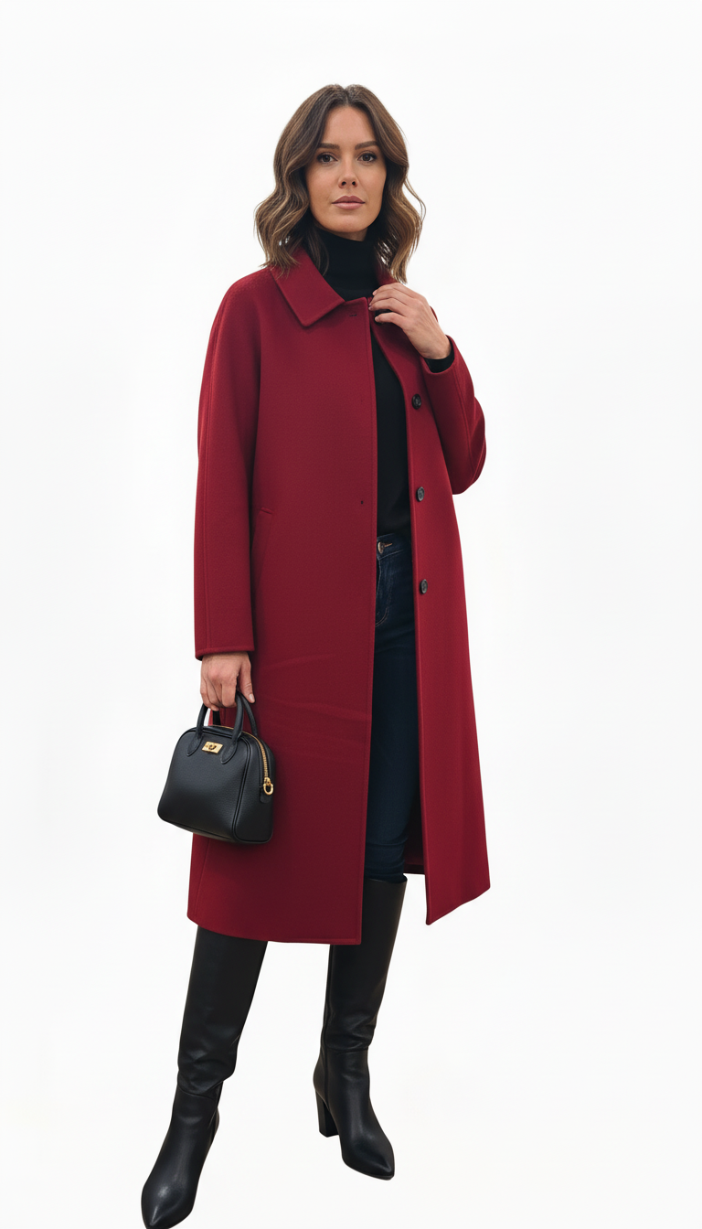 A refined longline coat designed with a timeless silhouette, offering a polished and elegant look for any occasion. Crafted from a wool and cashmere blend, it drapes beautifully and adds effortless sophistication to your winter wardrobe.