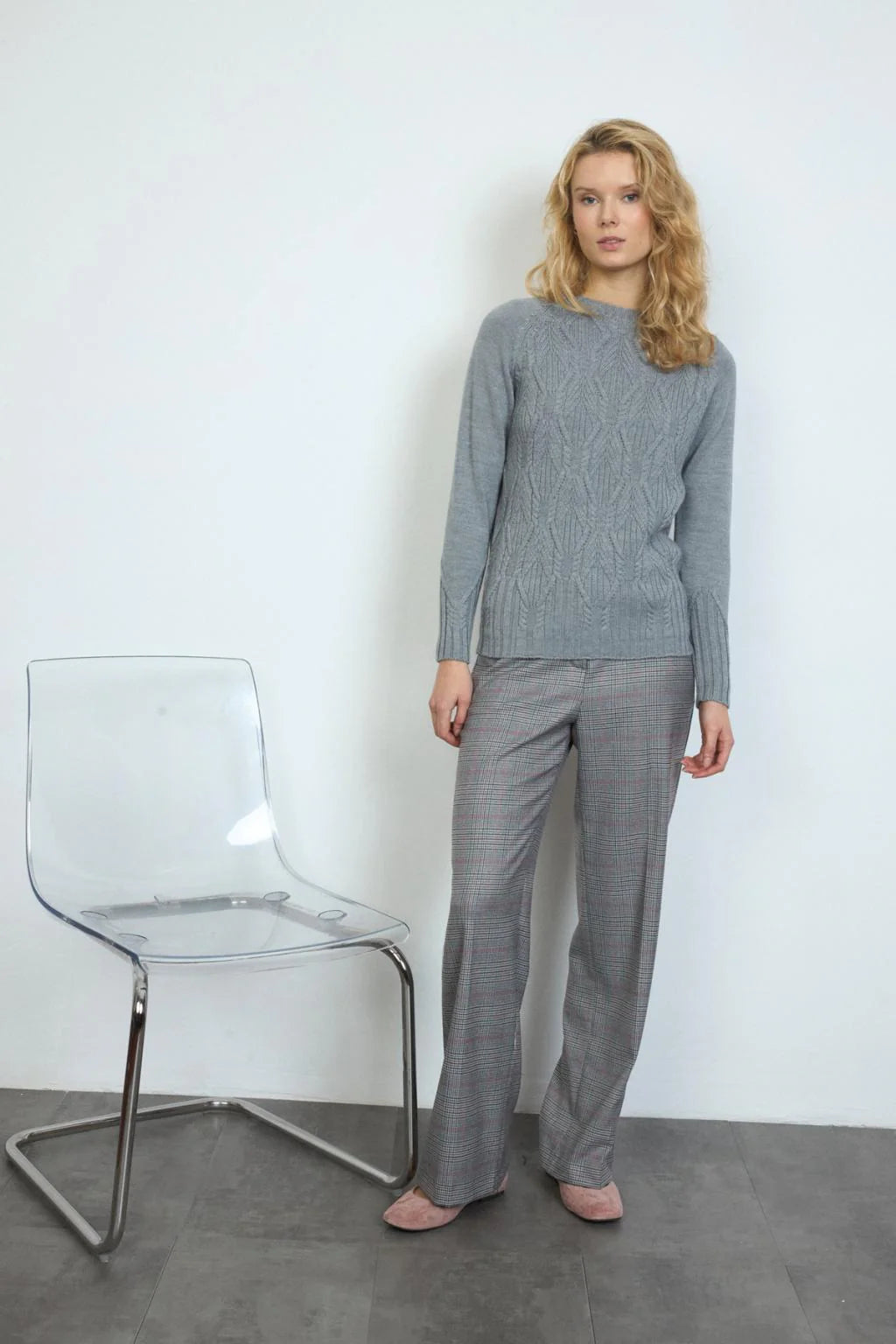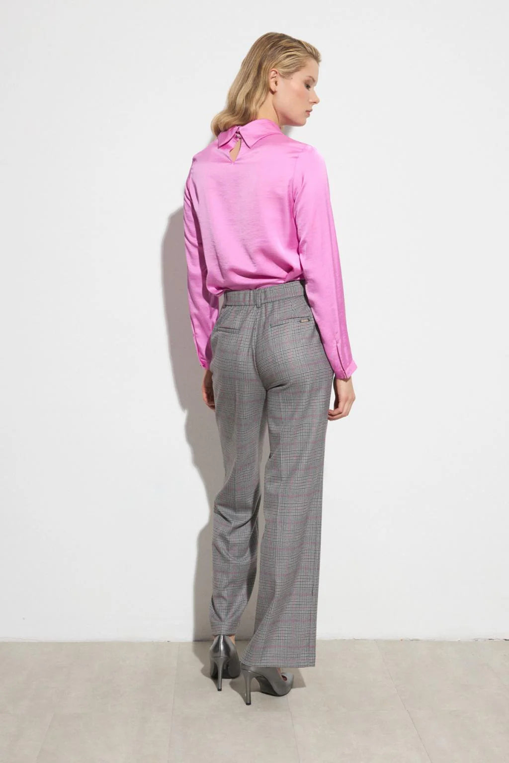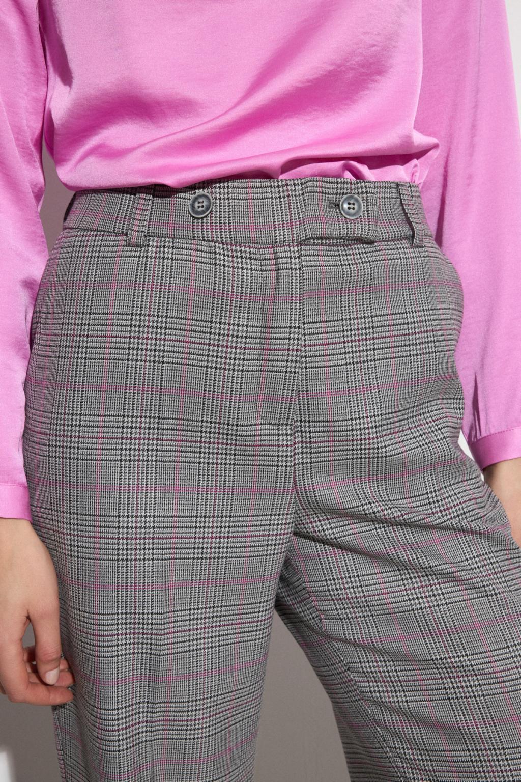 Wide-leg suit trousers. Checkered print. High waist. Waistband with belt loops and matching front button detail. Button and concealed zip closure. Side welt pockets.