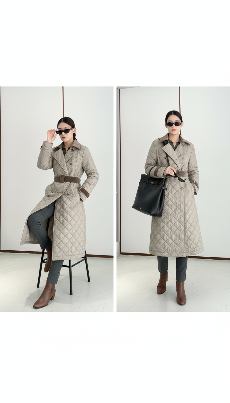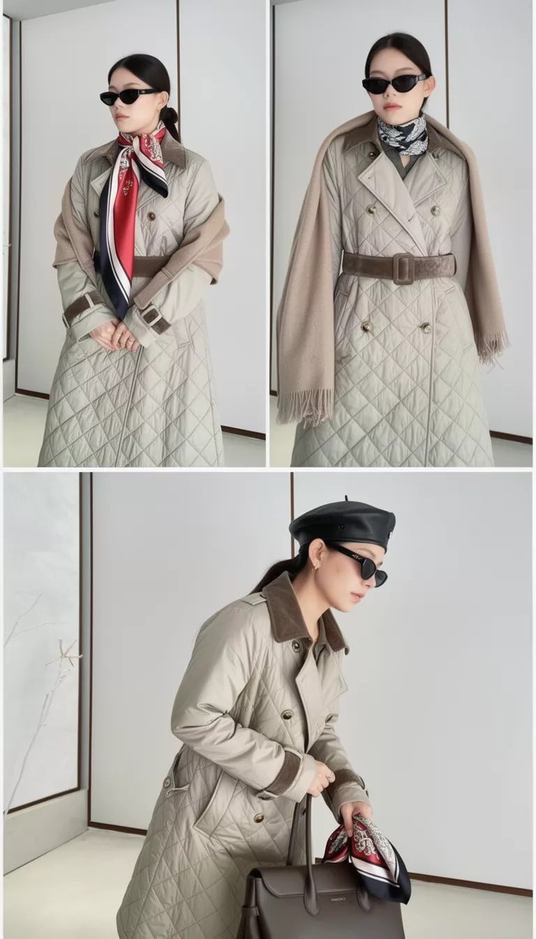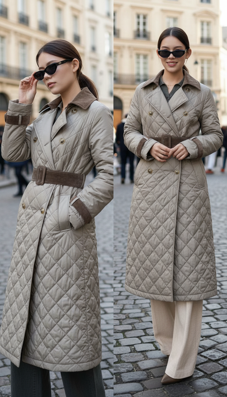 A sleek quilted trench coat with a flattering belted waist, double-breasted front, and lightweight comfort. Elegant, versatile, and perfect for elevated everyday style.