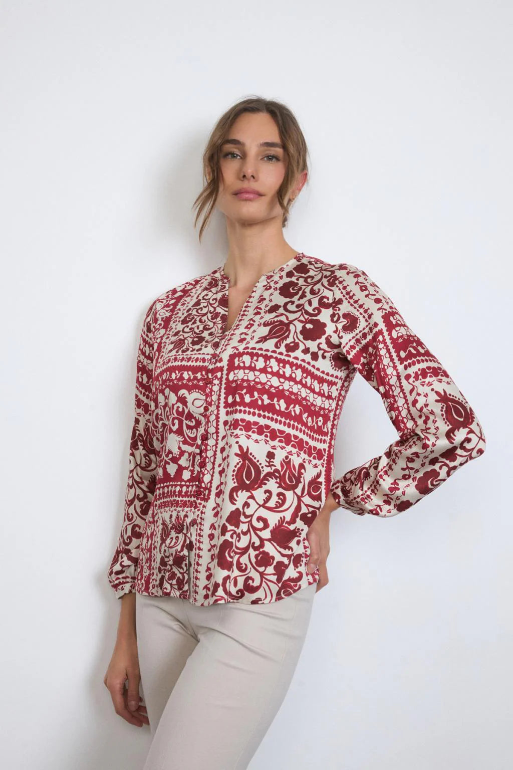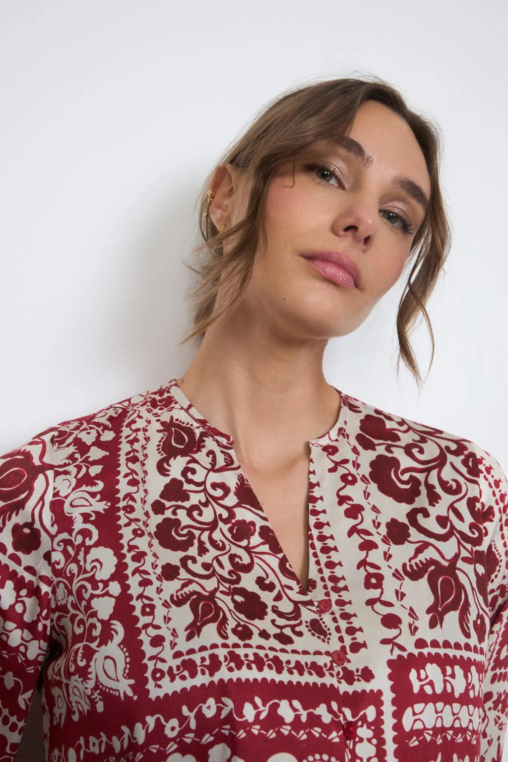 Printed shirt. Neck mao. Close with buttons to the tone. Straight design. Long sleeves with cuff closure. Straight down.