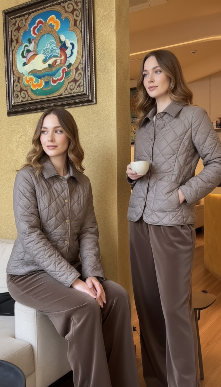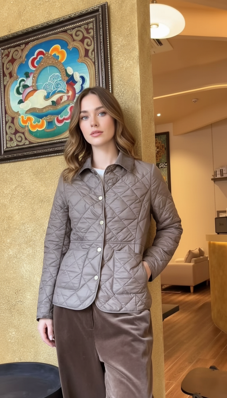 is a sleek, lightweight jacket designed for effortless everyday elegance. Featuring a classic diamond-quilted pattern, a clean collar, and subtle snap-button detailing, it offers a refined, versatile silhouette. Crafted with a durable 100% nylon outer shell, a breathable 100% cotton core, and a soft cotton-spandex lining, it provides comfortable warmth and structure—perfect for polished casual looks, city wear, and easy layering.